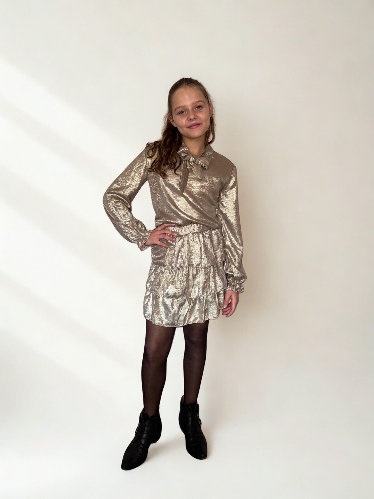 Het glanzende blousje met strikdetail en het bijpassende rokje met speelse laagjes geven een elegante én feestelijke uitstraling. Perfect voor speciale gelegenheden, feestjes of gewoon om de dag wat extra glamour te geven. 🌟